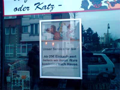 Mittlerweile seit einigen Wochen haben wir an den beiden Schaufenstern von "Picas Tierfutter" jeweils zwei Wechselrahmen für Plakate im DIN-A1-Format anbringen lassen. Jetzt können wir zumindest mal vor Ort auf bestimmte Produkte und Serviceleistungen hinweisen.