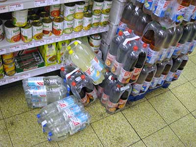 Ach, ist das schön, wenn die hochwertigen Bio-Konserven von einem zusammengebrochenen Stapel Getränke in der typischen Discountverpackung in Form von zu 6er-Trägern zusammengeschweißten 1,5-Liter-Flaschen blockiert werden.
