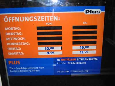 (Allerdings muss ich zugeben, dass dieses Öffnungszeitenschild an einer "speziellen" Plus-Filiale hing, in der irgendwann nur noch Sonderposten verkauft wurden.)