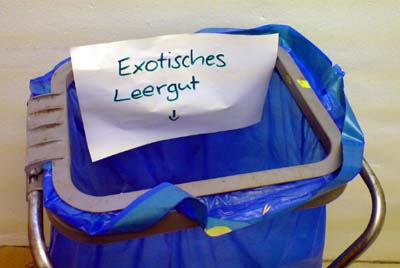 Am Freitag Abend hing plötzlich dieser Zettel mit der Aufschrift "Exotisches Leergut" am Müllbehälter vor dem Leergutautomaten. Wir sind aus dem Lachen gar nicht mehr rausgekommen.