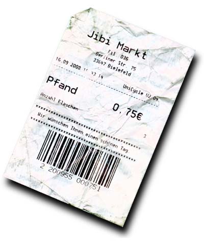 Diesen Leergutbon aus einem Jibi-Markt in Bielefeld haben wir hier mitten im Laden gefunden. Das Bondesign, der Aufdruck "UniCycle" und sowieso der "Trautwein"-Aufdruck auf der Papierrückseite machen klar, dass dieser Leergutbon von einem Automaten wie meinem stammt.