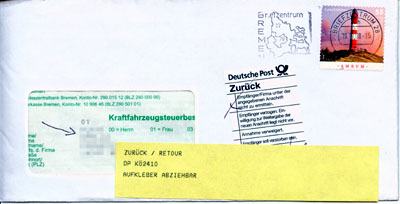 Vor einiger Zeit haben wir hier im Laden ein Dokument gefunden. "Kraftfahrzeugsteuerbescheid" stand da drauf. Sah zwar nicht lebenswichtig aus, aber ich versuchte natürlich, die Person telefonisch zu erreichen. Nachdem diese versuche scheiterten, steckte ich das Schreiben in einen Umschlag und wollte es per Post zuschicken.