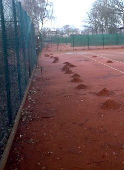 Einer der Tennisplätze in der Nähe des Weserstadions bot folgenden Anblick. Ich frage mich, ob da zur Platzpflege schon neuer Sand aufgeschüttet, aber noch nicht verteilt wurde – oder ob das wirklich das Werk eines Maulwurfes einer Maulwurfskolonie ist?