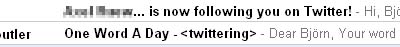 Heute war der gesuchte Begriff "twittering" und wo stand diese Mail? Genau unter einer Mail von Twitter, in der mir mitgeteilt wurde, dass jemand mein Geschreibsel dort verfolgt. Netter Zufall.