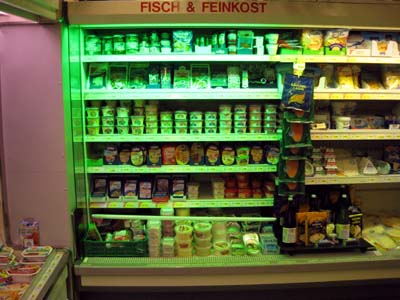 Was mir erst hier bei mir im Laden aufgefallen ist: Eine der Röhren war mit "grün" beschriftet – und was das bedeuten sollte, ahnten wir und wussten es mit Sicherheit, als wir die Röhre mal probeweise in eine der Fassungen im Kühlregal drehten. Sieht zwar witzig aus, ist aber vermutlich nicht besonders verkaufsfördernd, wenn hier alle Frischeprodukte einen grünen Schimmer haben.