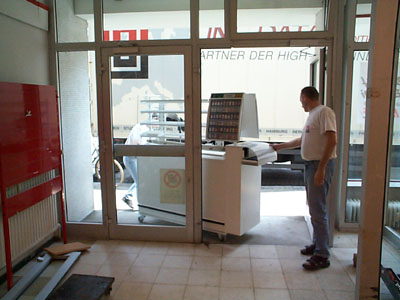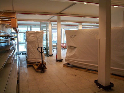 Hier sind noch ein paar Bilder von der Anlieferung des großen Kühlmöbels. Wie riesig die "Päckchen" sind kann man hier erst so richtig erkennen. Auf der Straße sahen die Kühlregalteile noch halbwegs übersichtlich aus, hier im engen Laden wirken sie einfach nur gigantisch: