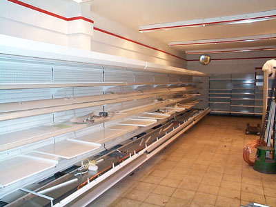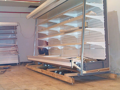 Das große Kühlregal ist inzwischen als solches erkennbar. Die Einzelteile sind aufgestellt und miteinander verbunden worden. Und nicht nur das: Auch die Anschlüsse für Kältemittel und Strom sind schon hergestellt. Wenn man genau hinsieht, erkennt man das Licht im Regal.