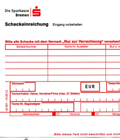 Was mir jetzt erst aufgefallen ist: Auf den Belegen meiner Bank zum Einreichen von Schecks ist Platz für fünf Belege. Gut, dass man in dem Feld "Stückzahl" auch eine vierstellige Summe notieren kann.