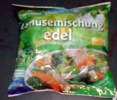 Die Kollegin, die hier zweimal pro Woche für die Verräumung der Tiefkühlware zuständig ist, hielt mir dieses Fundstück vor die Nase, das sie aus einer der Truhen gefischt hat. Es handelte sich um eine Gemüsemischung der Eigenmarke vom "Discounter an der Ecke". Wie kam