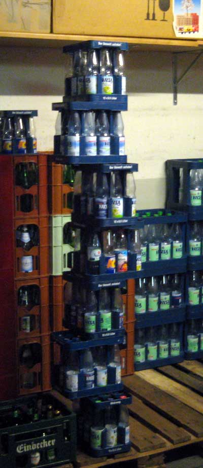 Zu spät kam der Aufschrei des Kollegen. Als er bemerkte, dass ich meine Kamera auf seinen zwischengelagerten Kistenturm hielt, war das Foto schon "im Kasten". Na, wie gut, dass das PET-Flaschen sind. Also für den Fall der Fälle, also falls es fällt. Sozusagen.