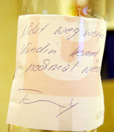 Die Unterschrift erkenne ich sogar nach Jahren wieder: "Tammy" ist aber schon seit mindestens fünf Jahren nicht mehr hier beschäftigt und ich vermute, JETZT interessiert es die Kundin auch nicht mehr, was mit der Flasche mit "