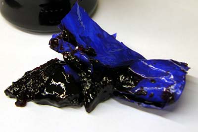 Natürlich nahm ich das Glas ohne Diskussion zurück und versprach, die Sache unverzüglich an den Produzenten weiterzuleiten. Vorher zupfte ich noch den blauen Fetzen komplett aus dem Glas heraus, woraufhin dieser sich als ein relativ großes Stück blaue Folie entpuppte:
