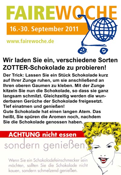 Unser Beitrag hier im Markt in der Gastfeldstraße zur diesjährigen "Fairen Woche": Eine personalneutrale Zotter-Verkostung.