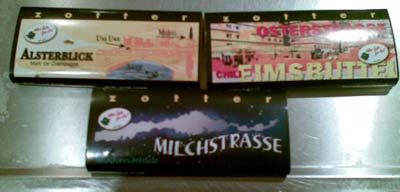 Nun, es sind nicht unbedingt neue Sorten, aber die optische Gestaltung ist neu und dem Laden angepasst. So ist immer das Logo vom Händler drauf. Auf der Tafel oben rechts ist sogar eine Außenansicht des Ladens. Oben links finden wir eine Skyline Hamburgs. Aber was die Milchstraße nun mit Hamburg oder dem Händler zu tun hat, weiß ich auch nicht.