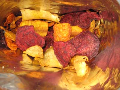 Die Gemüsechips waren interessant: Fein geschnittenes Gemüse, z.B. Rüben, wurden getrocknet und gewürzt. Solala, ein paar Sorten waren lecker, andere eher nicht so. Eine kalorienarme Alternative zu Kartoffelchips waren sie aber auf jeden Fall.