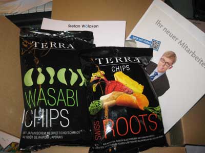 Stefan hat mir vor einer Weile einen kompletten Satz Bewerbungsunterlagen geschickt. Dabei lag der deutliche Hinweis, diese Bewerbung mit meinem Stempel (Den ich natürlich immer noch habe, aber der noch nie im Einsatz war!) zu bedrucken und zurückzusenden. Als "Bestechungsgeld" lagen noch ein paar Tüten Chips dabei. Einerseits ausgesprochen leckere Kartoffelchips mit Wasabi-Aroma, andererseits auch eine Tüte mit "Gemüsechips".