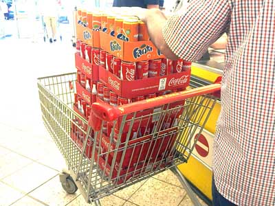 Von Luis beobachteter Großeinkauf in einem Laden, in dem es Cola-Dosen gerade zum Schnäppchenpreis gab. Würde mich nicht wundern, wenn es da an der Kasse noch eine Diskussion über die berühmten "haushaltsüblichen Mengen" gegeben hat.