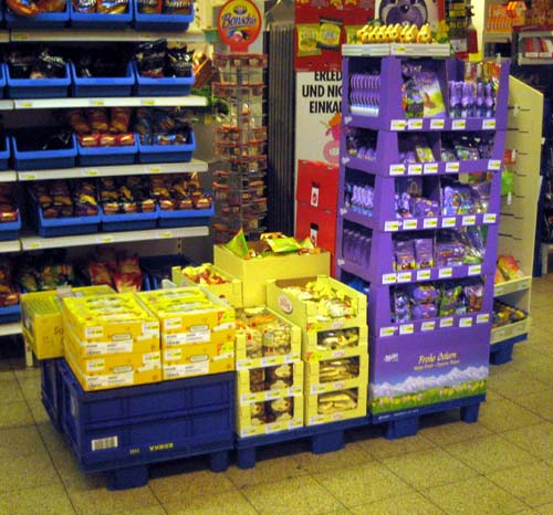 Wir haben die Ostersüßwaren für die Saison 2013 aufgebaut. Es kommen zwar noch ein paar Teile nach, aber nicht mehr sehr viel. Durch die Erfahrungen der letzte Jahre haben wir die Mengen erheblich reduziert, wie auch schon