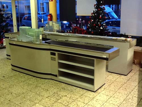 Kurzer Zwischenstand aus dem heute noch geschlossenen Markt in Findorff: Der neue Kassentisch steht an Ort und Stelle, die beiden alten Kassentische sind auf dem Schrott in Einzelteilen bei mir in der Halle zwischengelagert, das neue Kassensystem steht bereits.