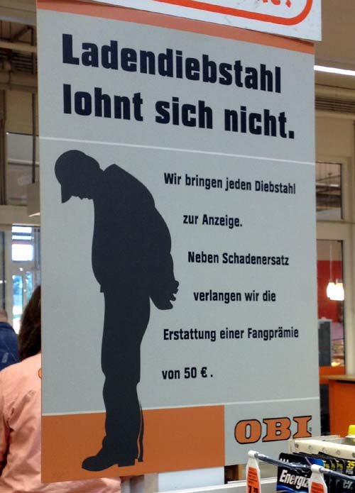 Dieses Schild habe ich in einem Obi-Baumarkt entdeckt. Dass Ladendiebe mit gesenktem Kopf hier bei mir herausgehen, habe ich selten oder sogar noch nie erlebt. Schön wär's…