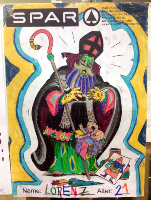 Als ich eben die Nikolaus-Ausmalbilder abgehängt habe, fiel mir dieses Bild auf. Was man nicht alles für ein Duplo tut.