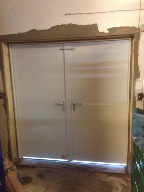 Die alte Pendeltür zwischen Lager und Laden ist nun auch verschwunden. Dort wird in diesem Augenblick eine feuerfeste Stahltür installiert, durch die sich der Brandschutz hier im Gebäude schonmal deutlich erhöht.