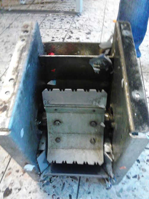 Selbst der kleine Leergutautomat in unserem Markt in der Münchener Straße, der ansonsten recht problemlos läuft, ist nicht vor größeren Ausfällen sicher. Nach mittlerweile rund sieben Jahren war nun auch da mal ein neuer Cruncher fällig. Abgesehen davon, dass er inzwischen relativ stumpf war und die zu zerdrückenden Gebinde kaum noch eingezogen hat, gab es auch noch ein anderes mechanisches Problem. Ein Zahnrad hatte sich gelöst, den Rest erledigten der kräftige Motor und der an der Welle angebrachte Zapfen.