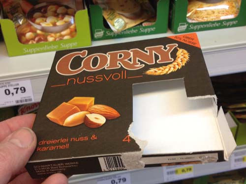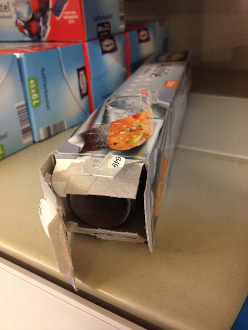 Was geht da in manchen Kunden vor? Vermutlich verlaufen die Gedanken da etwas so: "Oh, eine Packung mit der Aufschrift "Alufolie", auf der an zwei Seiten in Form eines Fotos eine halb abgerollte Rolle Aluminiumfolie abgebildet ist. Sogar auf dem Schild am Regal steht Alufolie – da muss ich doch gleich mal nachsehen, ob da auch wirklich Alufolie drin ist."