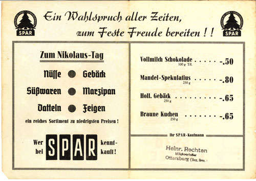 Leider ohne erkennbare Jahresangabe. Der SPAR-Tanne nach zu urteilen, müsste der Handzettel aus den ersten 20 Jahren der SPAR stammen. Also irgendwo um 1940 +/- 10 Jahre: