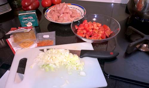 Eine der beiden "British-Indian-Curry"-Mischungen haben wir am Abend zu Hause für unser privates Abendessen zubereitet. Prinzipiell nicht viel Arbeit: Ein paar Zwiebeln und Tomaten kleinschneiden, andünsten, Fleisch dazu und schließlich die Currymischung mit in den Topf rühren. Das war in ein paar Minuten erledigt, der Reis stand länger auf dem Herd…