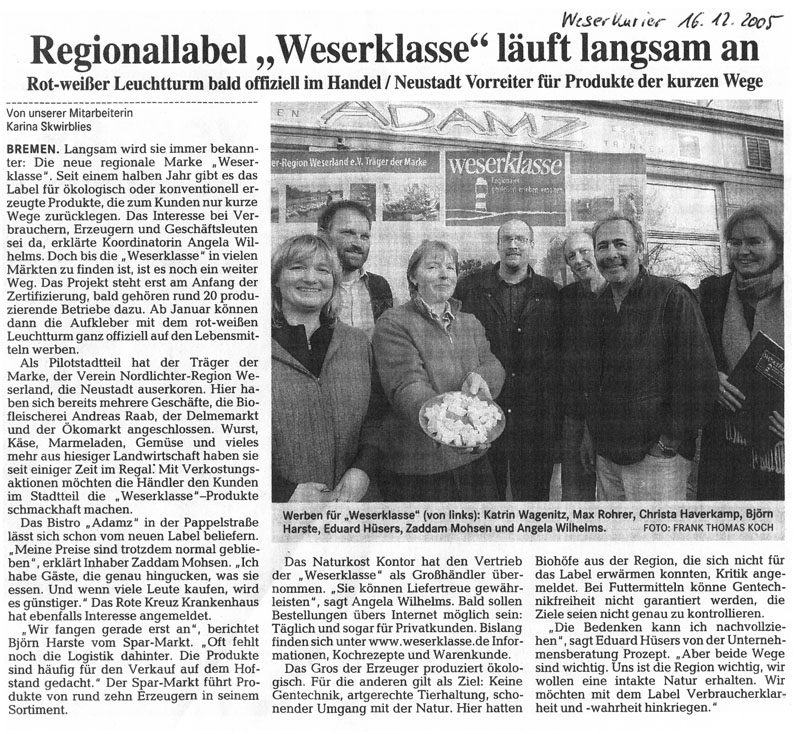 Weserklasse"-Projekt beteiligt sind, bzw. waren. Genauer gesagt waren wir sogar Teilnehmer der ersten Stunde. Die Idee hinter "Weserklasse" ist eigentlicch super: Ein eigenes Label für die Vermarktung regionaler Produkte aus dem Großraum Bremen / Wesermarsch.