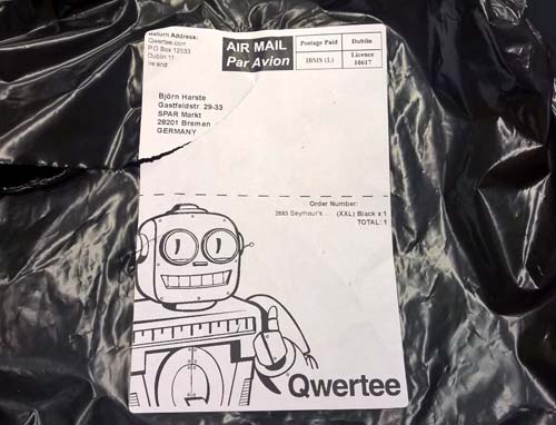 Qwertee-Versand an. Das ist nicht weiter ungewöhnlich, einer meiner Mitarbeiter bestellt dort hin und wieder mal und lässt sich die Shirts hier in den Laden liefern. Diesmal stand zwar nicht sein Name drauf, aber da er der einzige ist, der dort bestellt, war die Sache eigentlich klar. Mein Mitarbeiter drückte mir später den geöffneten Beutel wieder mit den Worten in die Hand, dass das definitiv nicht sein Shirt sei. Hmm…