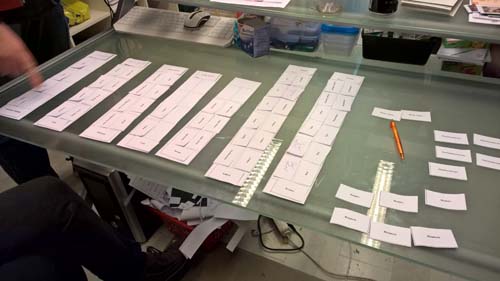 Dann ging die Bastelei los. Es fühlte sich an wie eine Mischung aus einem Puzzle und Memory. Es gibt natürliche einige Dinge zu berücksichtigen: Kaffee sollte nicht versteckt stehen, "Frühstück" sollte im vorderen Bereich bleiben. bestimmte Warengruppen wollte ich zwingend an Kopfregalen stehen haben, sowas wie Fairtrade-Produkte sollten aufgrund des besonderen Sortimentes wiederum an exponierter Stelle stehen. Dazu war mir aber wichtig, dass die Bereiche auch noch thematisch wenigstens halbwegs zueinander passten. Also nicht gerade Fischkonserven unmittelbar neben den Keksen. Das klingt in der Theorie alles leichter, als es letztendlich ist: Rund 1,5 Stunden haben wir hier im Büro getüftelt und immer wieder die Kärtchen verschoben und neu gelegt.