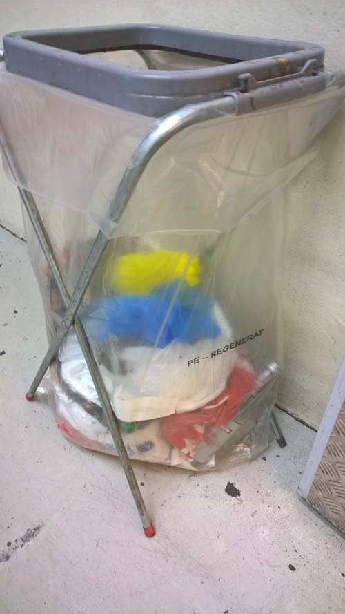 Im Lager hatte ich noch einen Karton mit hunderten durchsichtigen Müllsäcken gefunden. Die benutzen wir jetzt hier intern für sämtliche Müllbehälter und auch als Müllsack vor dem Leergutautomaten. Interessant, was die Leute hier so alles anschleppen.