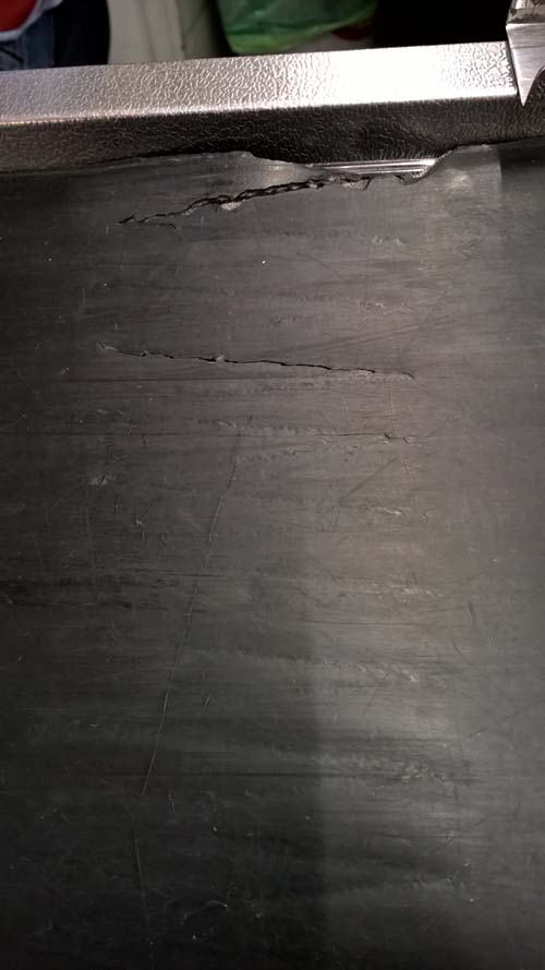 un-be-dingt einen neuen Kassentisch brauchen: Das Förderband an unserer ersten Kasse löst sich langsam an der (gezackten) Nahtstelle auf.