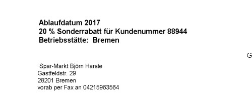 Jetzt werden Werbefaxe sogar schon mit einer "Kundennummer" versehen, um sie seriöser aussehen zu lassen. War tatsächlich etwas erfolgreich, ich habe nämlich ernsthaft einen Moment über das Schreiben nachgedacht (und auch mein E-Mail-Archiv nach dem Namen des Anbieters durchforstet), weil die Kundennummer den Eindruck hinterließ, dass wir schon einmal Kontakt hatten.