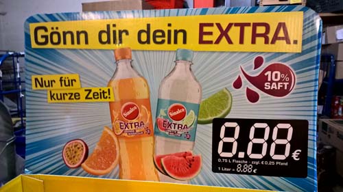 Da hatten mein Azubi und ich fast zeitgleich die gleiche Idee für einen Firlefanz-Blogeintrag. Wir haben einen Aufsteller mit verschiedenen "Sinalco"-Limonaden bekommen. Der "Crowner", wie diese oben angesteckten Schilder gerne genannt werden, beinhaltet ein "LCD"-Feld, wo man durch Ausmalen der entsprechenden Felder den Preis eintragen kann.
