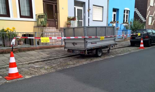 Morgen früh soll der LKW noch einmal herkommen. Wie es der Zufall wollte, waren gerade eben die entscheidenden Parkplätze in der Kantstraße frei. Schnell den Anhänger dort hingestellt, zwei Pylonen daneben, vor alles ein Flatterband und dann noch Schilder dran mit dem Hinweis "