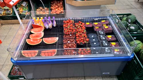 Ohne weitere Schäden haben wir die Truhe gestern Abend hier noch in den Laden gestellt. Die Farbgebung ist schon "zukunftsweisend", aber den "Wir lieben Lebensmittel"-Aufkleber habe ich trotzdem entfernt. Wir sind noch kein Edeka-Markt und damit darf ich offiziell diese Werbemittel auch noch nicht benutzen.