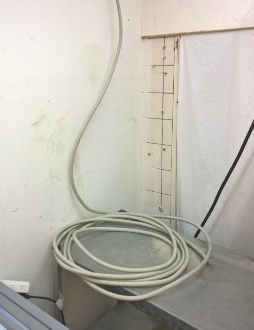 Die paar NYM-Leitungen, die oben im Vordergrund in den Kasten eingeführt werden, sind übrigens allesamt während unserer Zeit dazugekommen. Videoanlage, Alarmanlage, Drehstrom für den Backofen im Laden, Drehstrom für die Klimaanlage. Letzteres ist übrigens das (vorhin ausgebaute) ganz dicke Kabel oben in der Mitte – tzja, und genau das Teil war der Grund, warum ich den Sicherungskasten überhaupt geöffnet hatte. Die Klimaanlage soll zwar bleiben, aber natürlich ebenfalls zukünftig vom neuen Verteiler versorgt werden. Dummerweise hing das steife Kabel auf der Ladenseite meinen neuen Brüstungskanälen im Weg. Da es aber in der Form dort auch zukünftig nicht weiter verwendet werden soll, musste es weg.