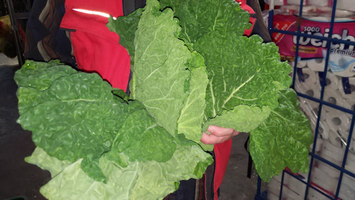 Was ich bis vor einer Weile nicht wusste: Wirsing kann auch schon verwendet werden, wenn er noch keinen festen Kopf hat und manchmal wird er auch so verkauft. Die losen, großen Blätter erinnern entfernt an Mangold, aber nicht ernsthaft an die bekannten Kohlköpfe.
