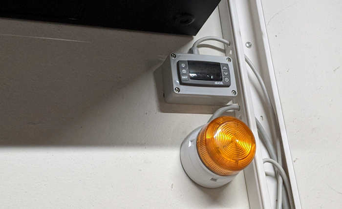 Unter den beiden Netzwerkschränken im Lager ist etwas neues gewachsen: Eine Temperaturanzeige und eine Blitzlampe, die im Falle einer zu hohen Temperatur in den beiden Räumen auf das Problem aufmerksam machen soll.