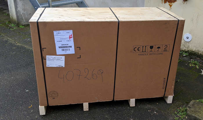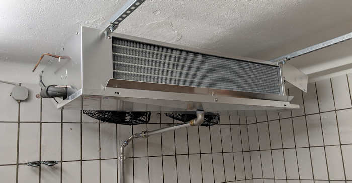 Hier liegt der Inhalt des großen Pappkartons: Der Verdampfer für den Tiefkühlraum. Ohne "Zoidberg"-Scharniere. Momentan sind die Monteure dabei, die Halterungen für das gute Stück im Kühlraum zu montieren und dann kann das Gerät auch schon aufgehängt und angeschlossen werden.