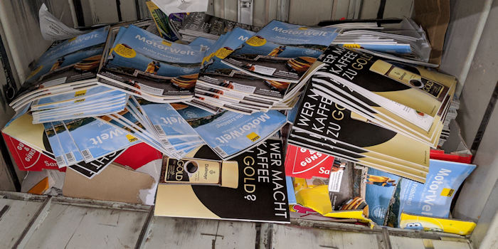 Es war eine ziemlich dicke Schicht ADAC-Motorwelten zwischen den gepressten Kartons, die den ansonsten ca. 130-150 kg scheren Ballen um locker weitere 50 kg schwerer als gewöhnlich gemacht hat. Entweder ist die Zahl der ADAC-Mitglieder hier generell niedrig oder der Club hat sich mit der Änderung keinen Gefallen getan. (Oder langfristig doch, wenn die Hefte erst gar nicht mehr gedruckt werden müssen, weil sie keiner mehr haben will …)