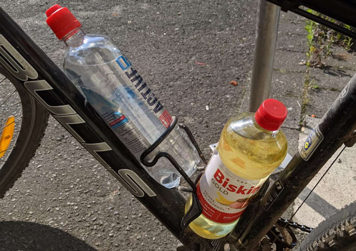 Da bei meinem alten MTB das Tretlager etwas knirscht, war ich unterwegs geneigt, einen Teil des Inhalts der Biskin-Flasche in den Antrieb zu schütten. Aber einerseits hätte es das Problem nicht nachhaltig gelöst (nach >15 Jahren sind die Lager wohl mal am Ende), zum anderen gehört Pflanzenöl einfach nicht auf mechanische Bauteile.