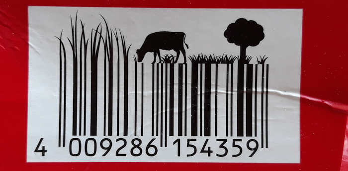 Fundstück von Susanne auf einer Packung "Beef Nuggets" von Block House: Ein Strichcode mit einer weidenden Kuh. Muh. Vielen Dank für die Zusendung!