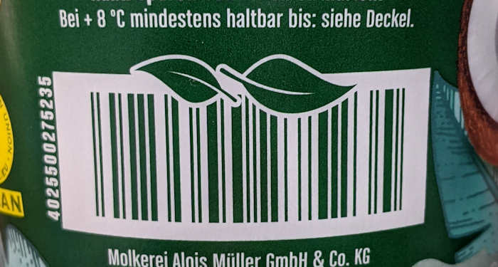 Fundstück auf dem veganen Pudding von Müller: Ein Strichcode mit Blättern.