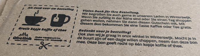 Drittens gab es noch einen Gutschein für ein Heißgetränk im Obelink-Laden in Winterswijk. Fand ich auch cool.