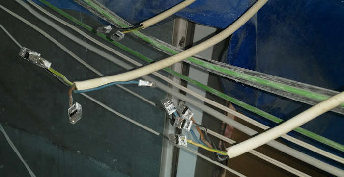 (An der mittleren Strippe auf dem Bild hing vor einer Weile übrigens noch mein altes Büro dran. Wer da und bei dem Kabel im Vordergrund eine Ader vermissen sollte: Da sind nur vier. Braun, schwarz und blau (!) beherbergen die Außenleiter, der grüngelbe diente als PEN.)