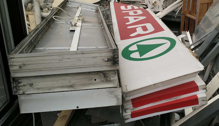 Da liegt sie hinten auf dem Hof zwischen dem ganzen anderen Geraffel, unsere alte Werbeanlage. Die Kästen sollten ohnehin auf den Schrott kommen, die Hauben, zumindest die mit dem SPAR-Schriftzug und der Tanne, wollte ich eigentlich aufbewahren.